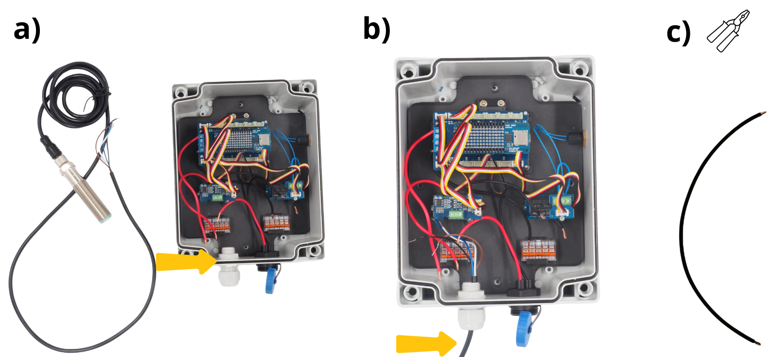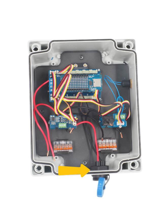 Faire passer le câble du capteur SEN0358 dans le presse étoupe, puis fixer le presse étoupe en le serrant avec l’extrémité précédement dévissée.