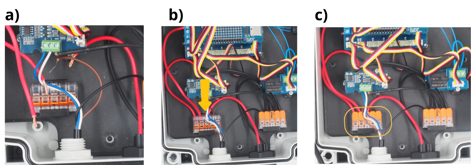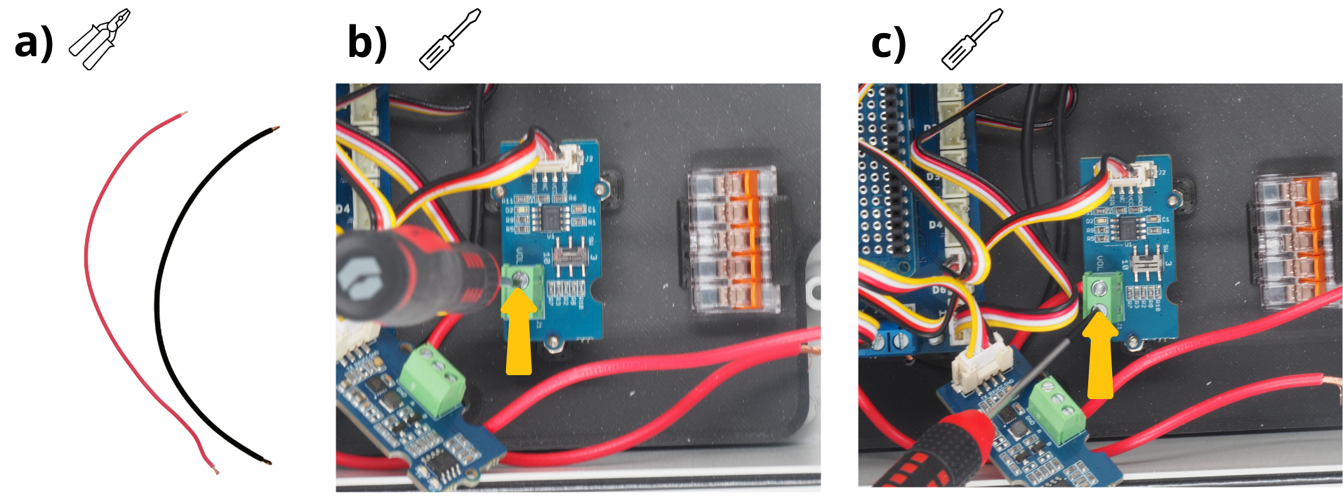 Pour les étapes qui suivent, il vous sera réguliérement demandé d’insérer des câbles dans différents borniers à vis, puis de les visser. Pour cela, il sera parfois nécessaire de d’abord dévisser le bornier à vis (voir image), afin de l”ouvrir, et permettre d’y insérer un câble avant de revisser pour fermer le bornier sur câble.