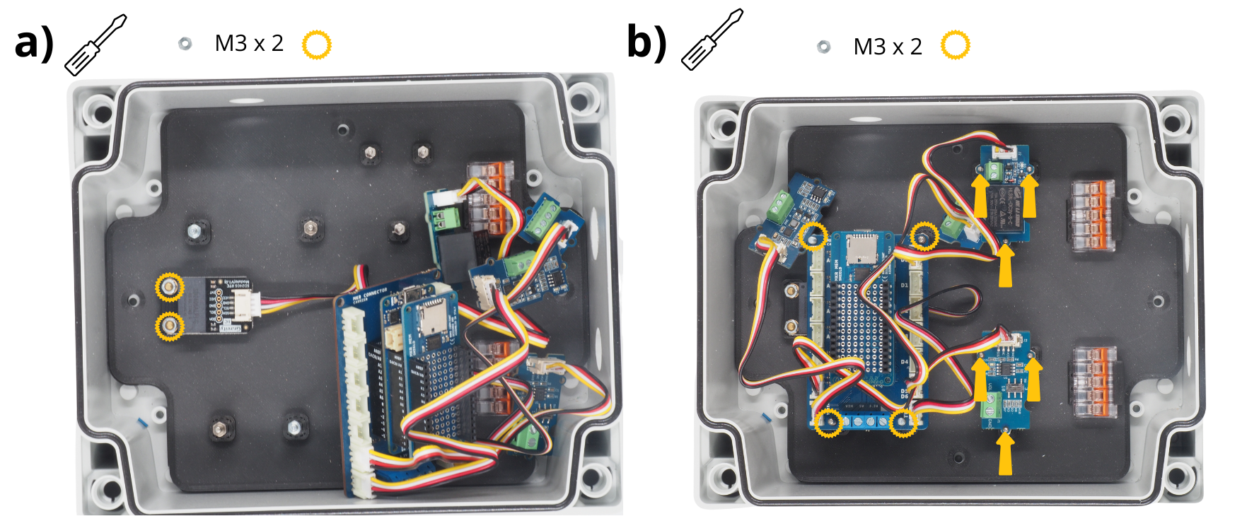 Fixer à l’aide d’entretoises M2 le module Grove Voltage Divider ainsi que le module Grove Relay.