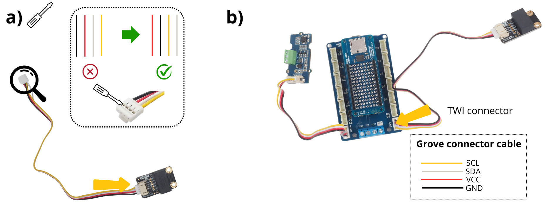 Prendre la carte Gravity RTC et brancher le câble Grove Connector fourni avec. Sur l’autre extrémité du câble, utilisé un tournevis plat fin afin d’inverser le câble rouge et noir, ainsi que le câble blanc et jaune.