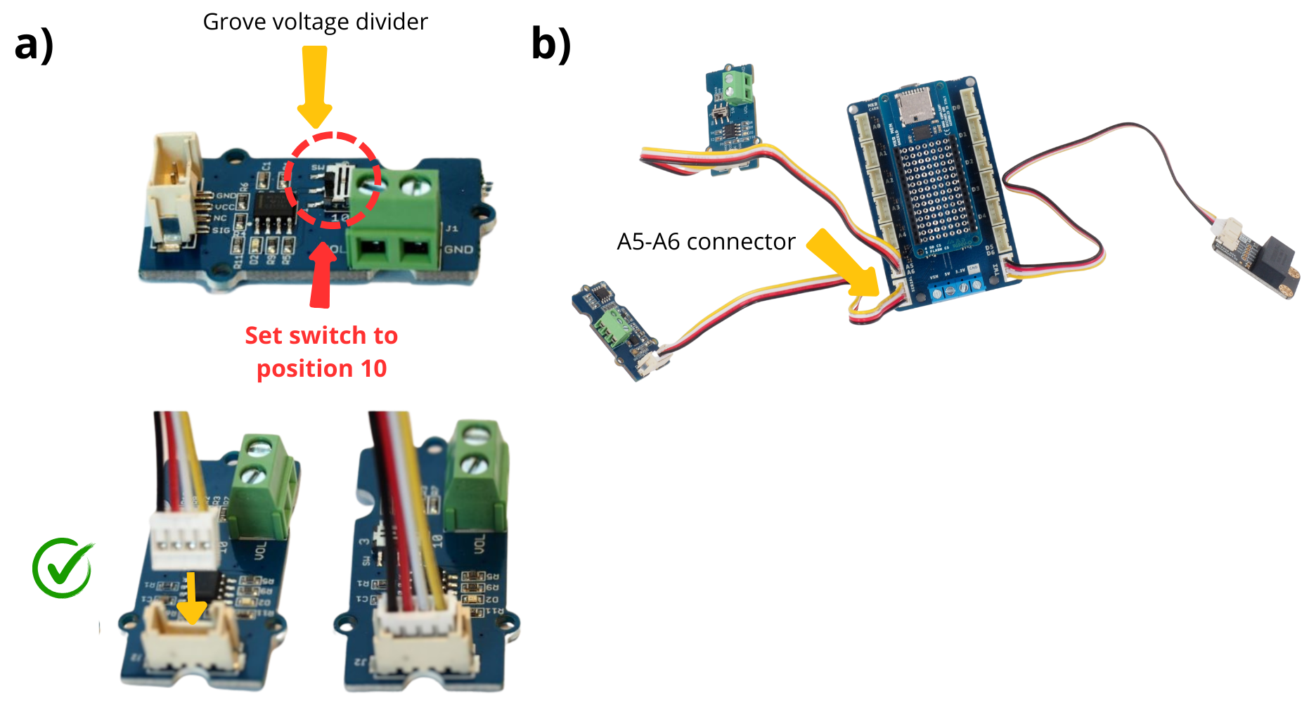 Prendre la carte diviseur de tension et brancher le câble Grove Connector fourni avec. Switcher le curseur de la position initial 3 à la position 10.