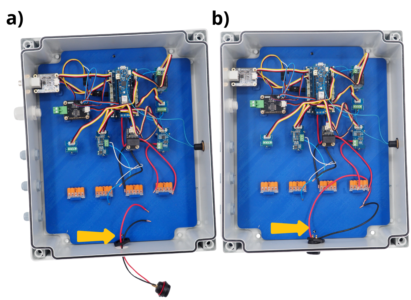 Insérer dans chacun de ces leviers l’extrémité restante des câbles noirs suivants : En provenance du module Grove Voltage Divider, en provenance du bloc d’alimentation, en provenance de la carte Arduino CARRIER, en provenance du capteur Oxygène dissous et en provenance du capteur Conductivité.