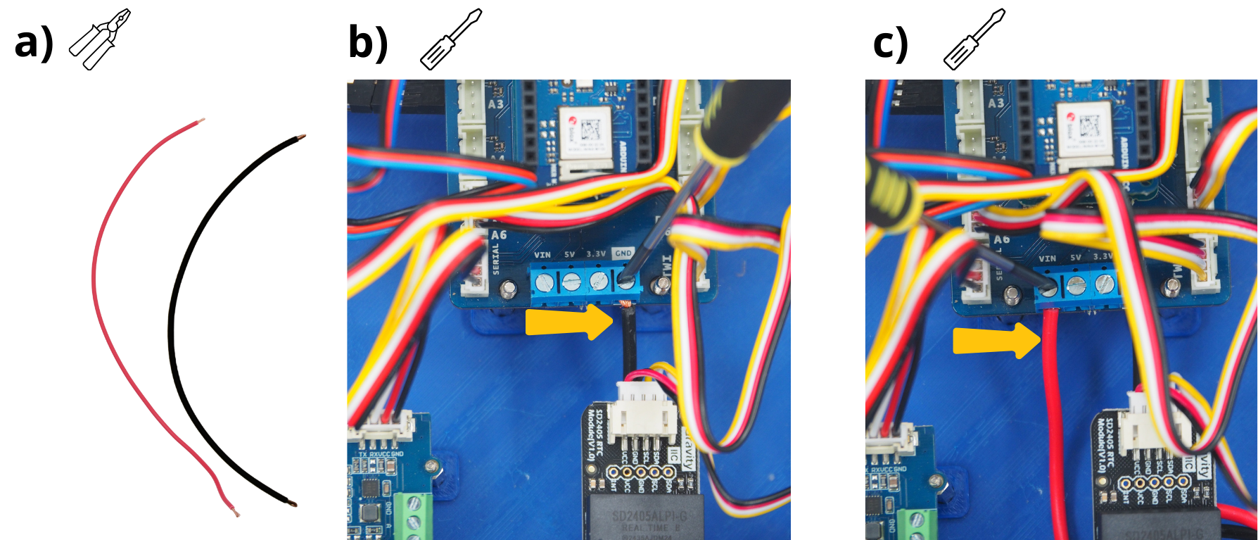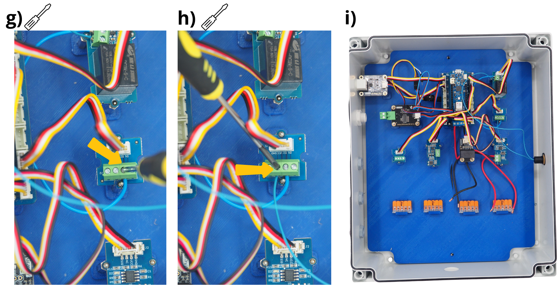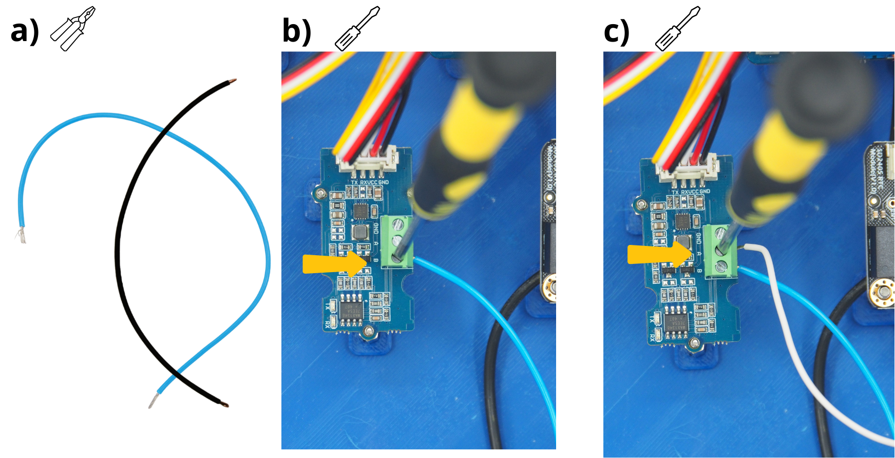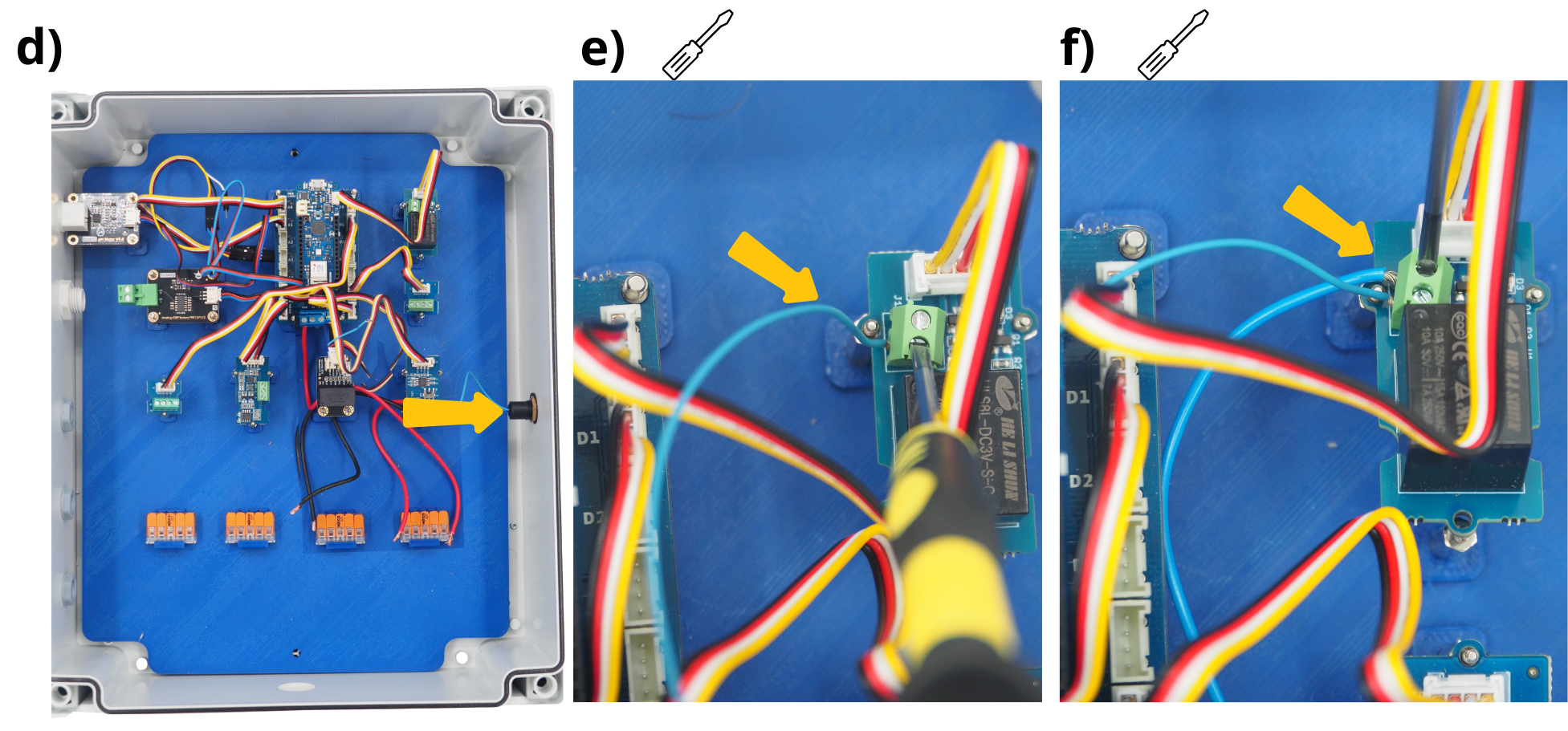 Pour les étapes qui suivent, il vous sera réguliérement demandé d’insérer des câbles dans différents borniers à vis, puis de les visser. Pour cela, il sera parfois nécessaire de d’abord dévisser le bornier à vis (voir image), afin de l”ouvrir, et permettre d’y insérer un câble avant de revisser pour fermer le bornier sur câble.