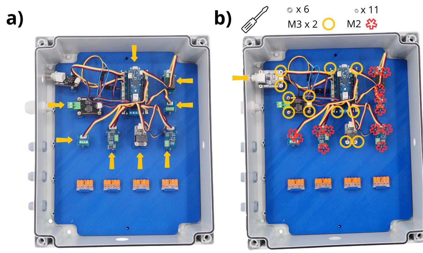 Fixer à l’aide d’écrous M3 les cartes capteur ORP, capteur pH, Arduino et RTC. Puis fixer à l’aide d’écrous M2 les cartes RS485, voltage divider, screw terminal et relais.