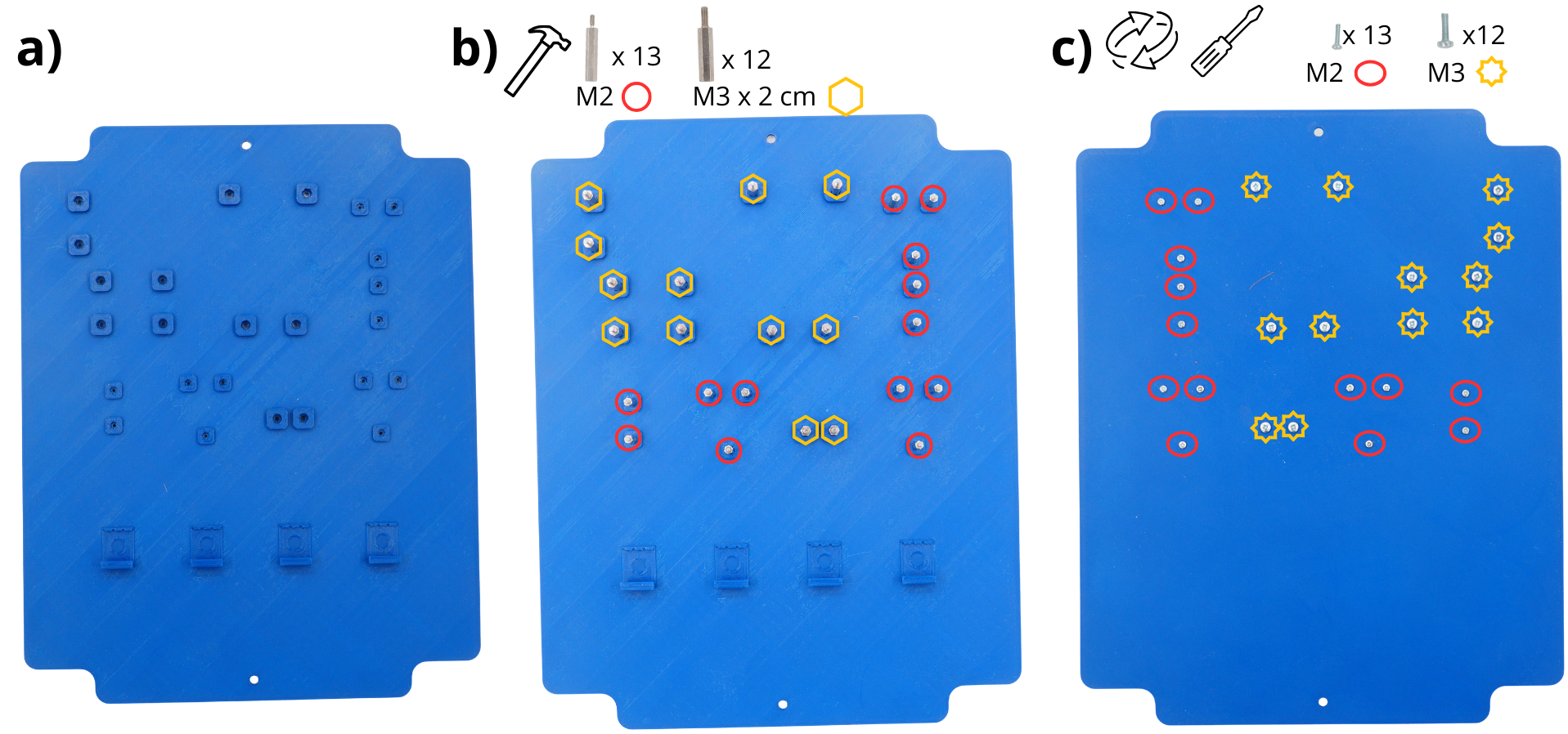 Retourner la plaque, et insérer les vis M2 et les vis M3 dans les trous prévus à cet effet afin de fixer les entretoises.
