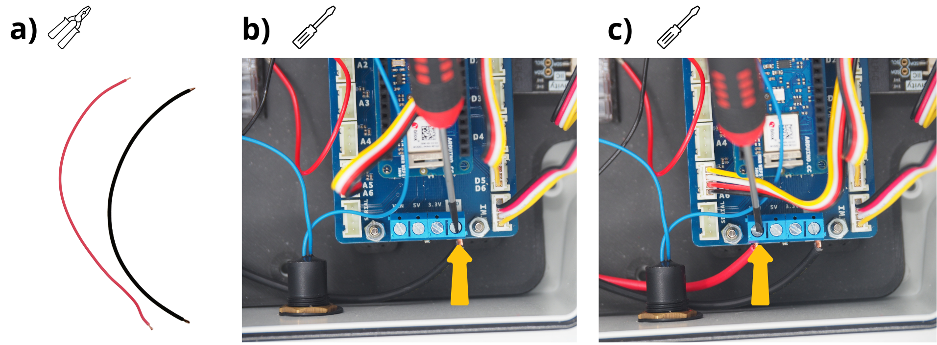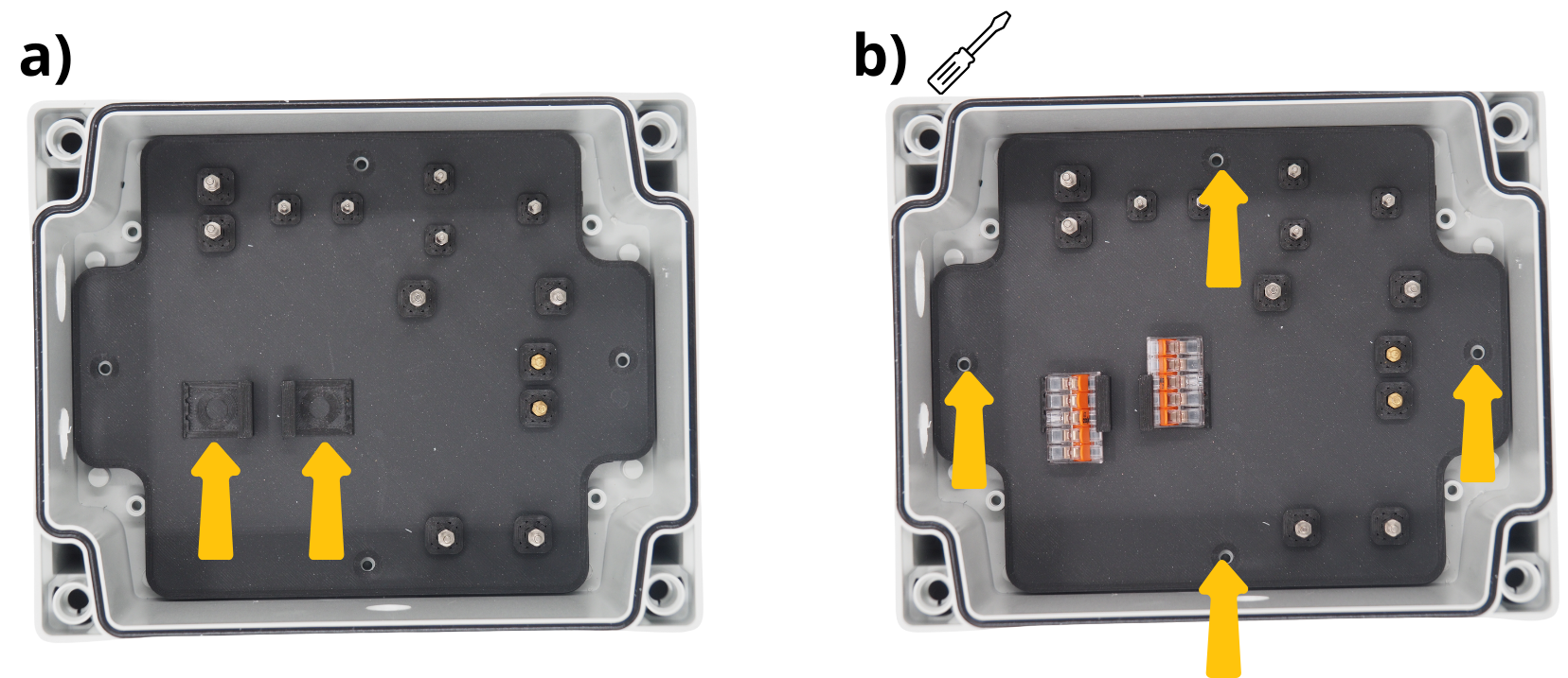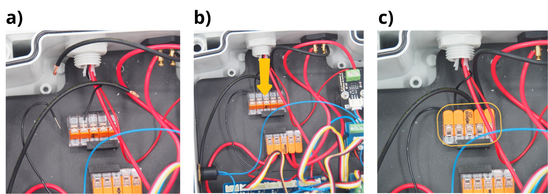 Pour les étapes qui suivent, il vous sera réguliérement demandé d’insérer des câbles dans différents borniers à vis, puis de les visser. Pour cela, il sera parfois nécessaire de d’abord dévisser le bornier à vis (voir image), afin de l”ouvrir, et permettre d’y insérer un câble avant de revisser pour fermer le bornier sur câble.