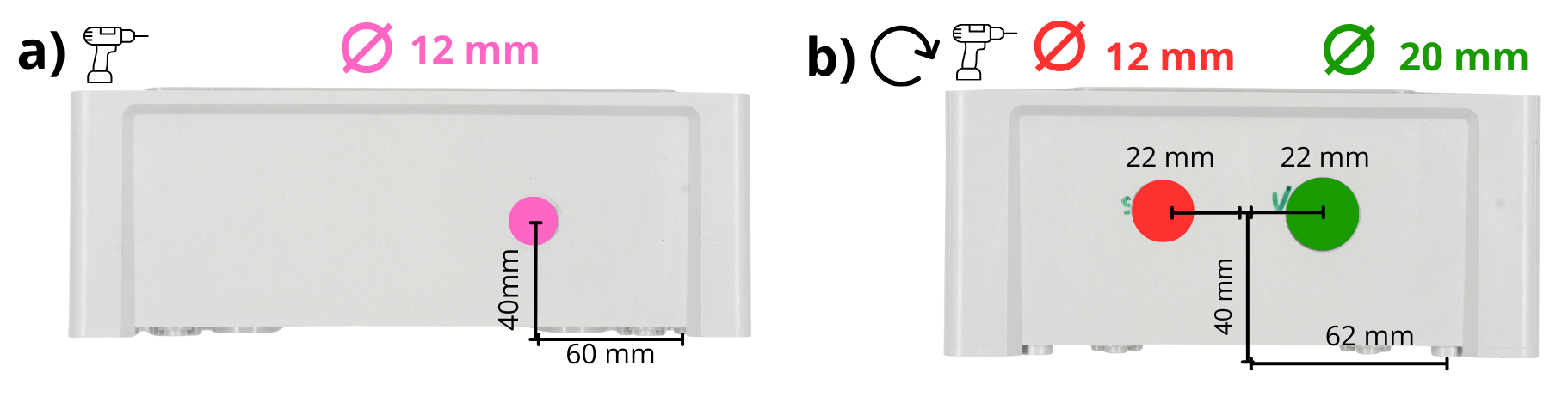 Prendre le boîtier, et percer un trou de 20 mm de diamètre sur le côté le plus court, ainsi qu’un trou de 12 mm de diamètre (voir indication ci-dessous).