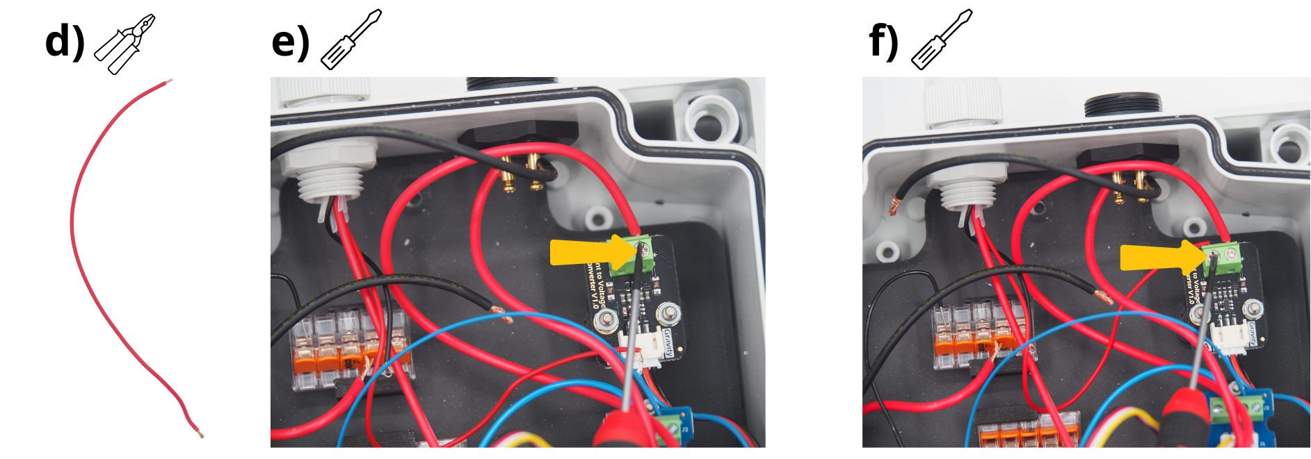 Insérer le câble rouge dans le bornier à vis « + » du module Current to Voltage et le visser.