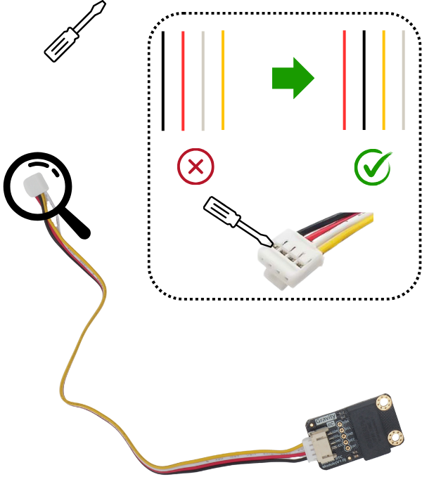 Prendre la carte Gravity RTC et un câble Grove Connector. Le brancher sur le module Gravity RTC. Sur l’autre extrémité du câble, utiliser un tournevis plat fin afin d’inverser le câble rouge et noir, ainsi que le câble blanc et jaune.