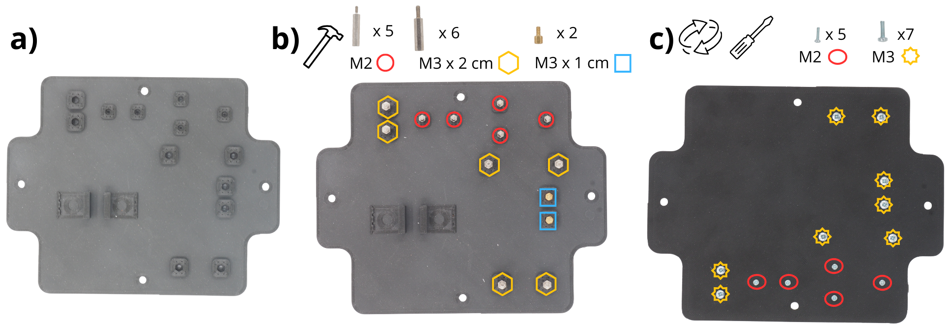 Insérer les entretoises M2 de 1.5 cm, les entretoises M3 de 2 cm, et les entretoises M3 de 1 cm dans les trous prévus à cet effet. Elles peuvent être insérées dans les deux sens, au choix. Vous pouvez utiliser un marteau pour les enfoncer plus profondément.