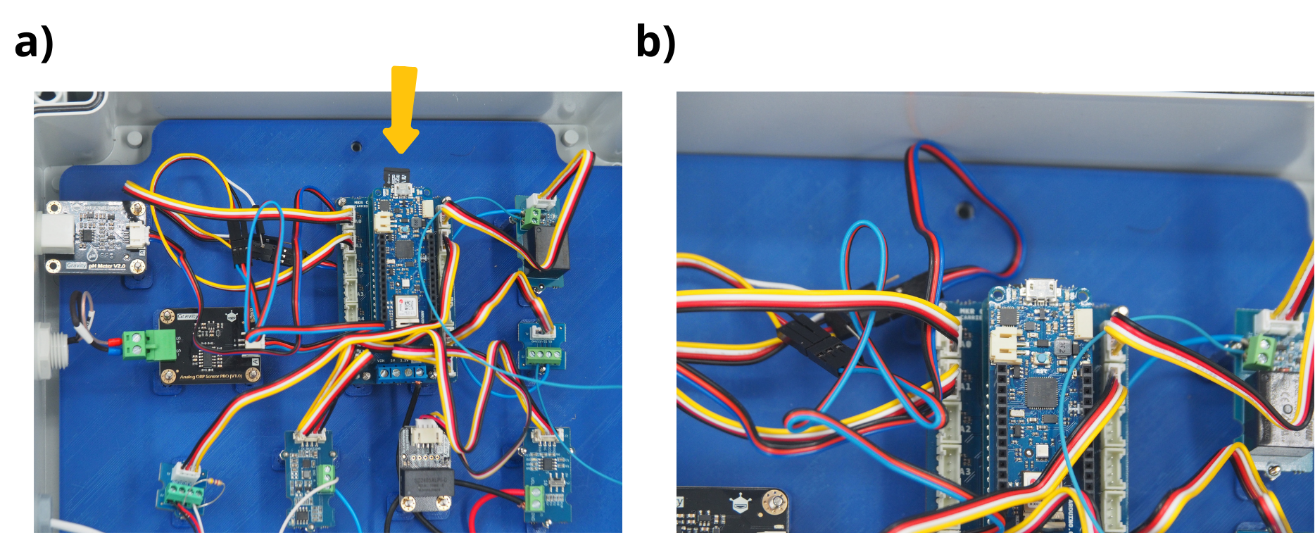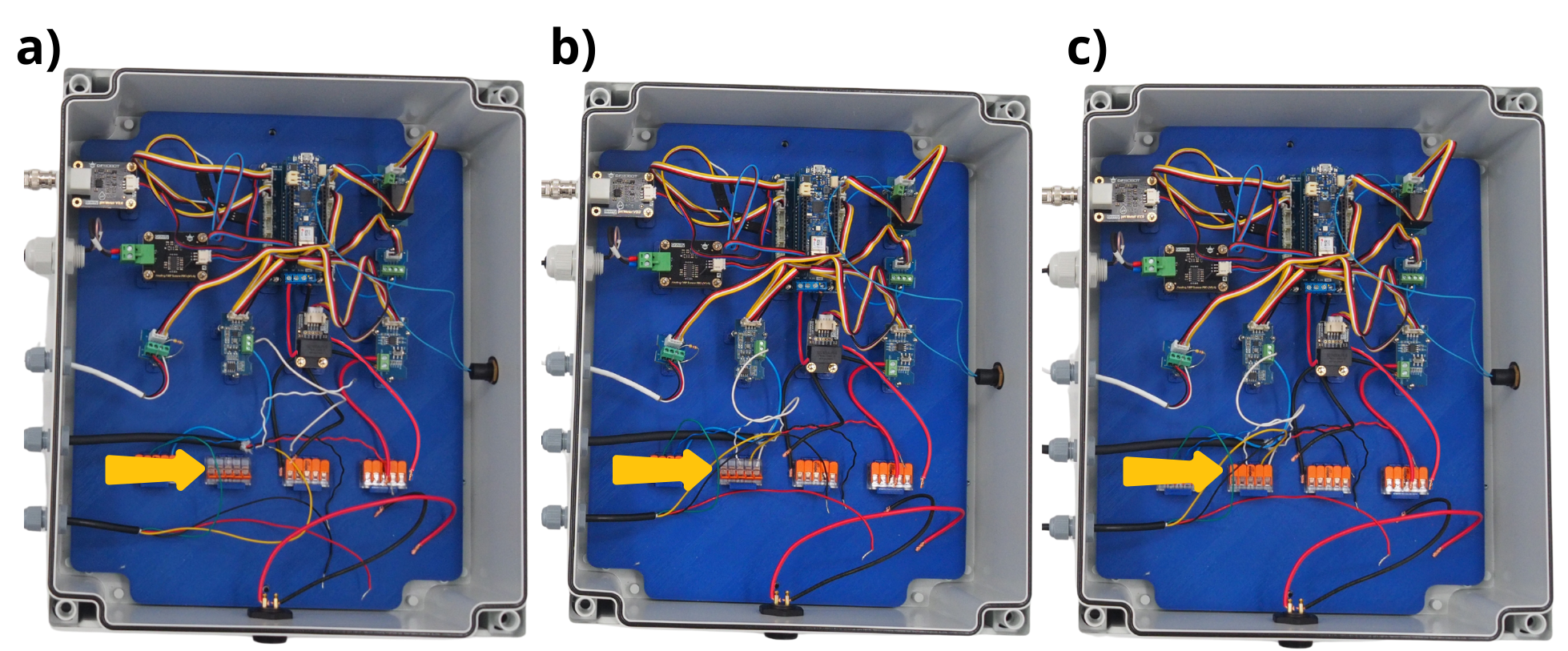 Secure the ORP sensor board, pH sensor board, Arduino board, and RTC with M3 nuts. Then secure the RS485 board, voltageâdivider board, screwâterminal board, and relay board with M2 nuts.
