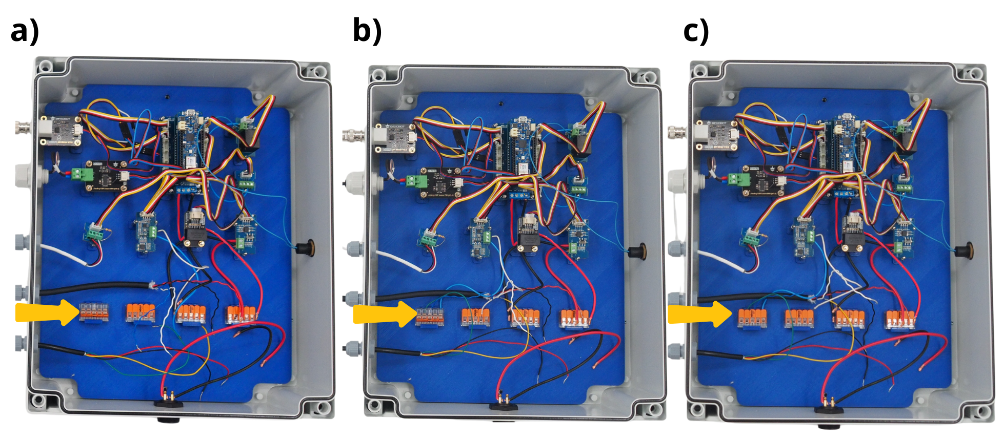 Insert into each lever the remaining end of the following black wires: from the Grove Voltage Divider module, from the power block, from the Arduino CARRIER board, from the Dissolved Oxygen sensor, and from the Conductivity sensor.