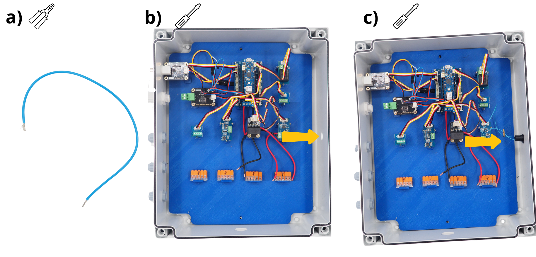 InsĂ©rer dans chacun de ces leviers les cĂąbles suivants : cĂąble blanc en provenance du bornier Ă vis âBâ du module RS485, cĂąble blanc en provenance du capteur OxygĂšne Dissous et cĂąble jaune en provenance du capteur ConductivitĂ©.
