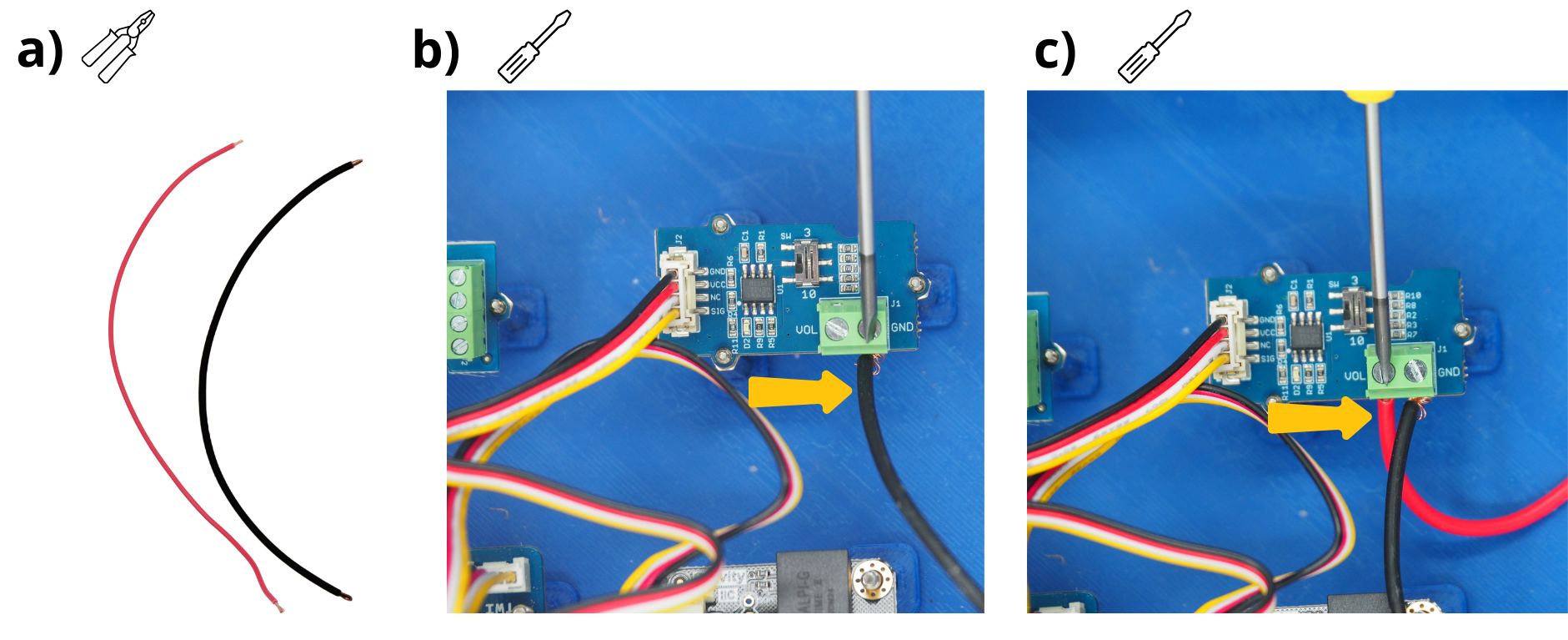 Pour les Ă©tapes qui suivent, il vous sera rĂ©guliĂ©rement demandĂ© dâinsĂ©rer des cĂąbles dans diffĂ©rents borniers Ă vis, puis de les visser. Pour cela, il sera parfois nĂ©cessaire de dâabord dĂ©visser le bornier Ă vis (voir image), afin de lâouvrir, et permettre dây insĂ©rer un cĂąble avant de revisser pour fermer le bornier sur cĂąble.