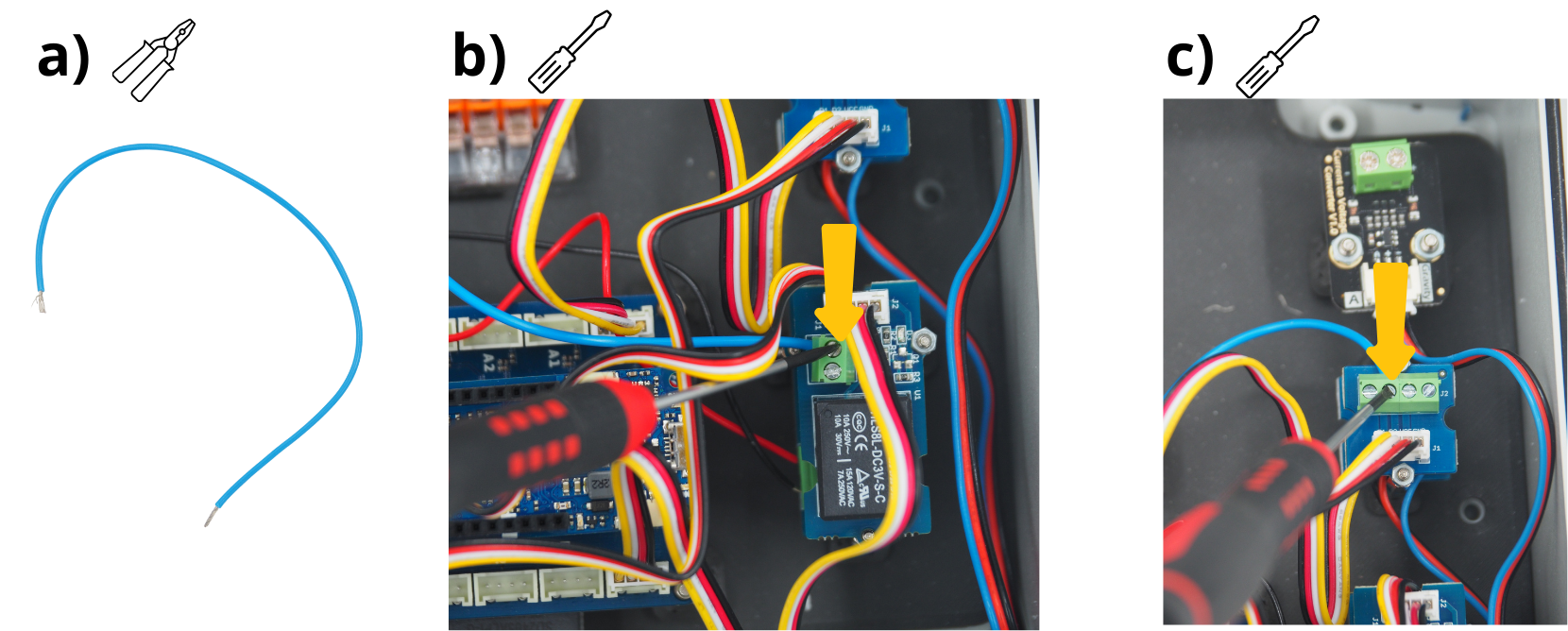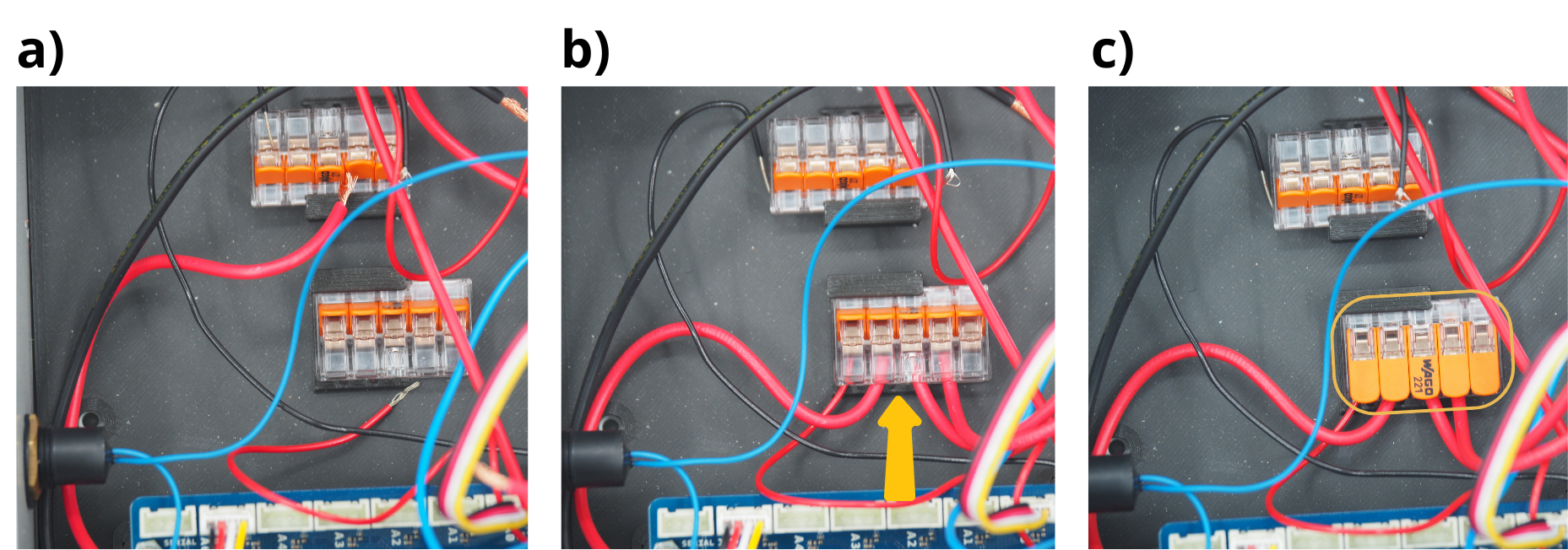 Pour les étapes qui suivent, il vous sera réguliérement demandé d’insérer des câbles dans différents borniers à vis, puis de les visser. Pour cela, il sera parfois nécessaire de d’abord dévisser le bornier à vis (voir image), afin de l’ouvrir, et permettre d’y insérer un câble avant de revisser pour fermer le bornier sur câble.