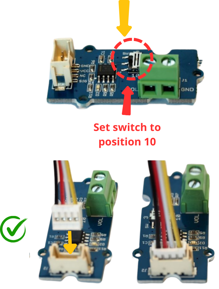 Ce module permet de mesurer la tension de batterie du système. Le sytème étant alimenté en 12 V, il est important de changer la position du commutateur. Prendre la carte diviseur de tension et brancher le câble Grove Connector fourni avec. Changer la position du commutateur pour le passer sur 10.