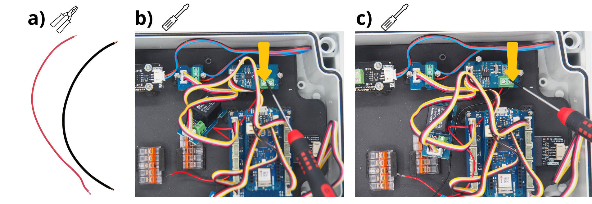 Insert the remaining ends of the following red wires into each lever: from the Current‑to‑Voltage module, from the Grove Voltage Divider module, from the power‑supply block, and from the Arduino CARRIER board.