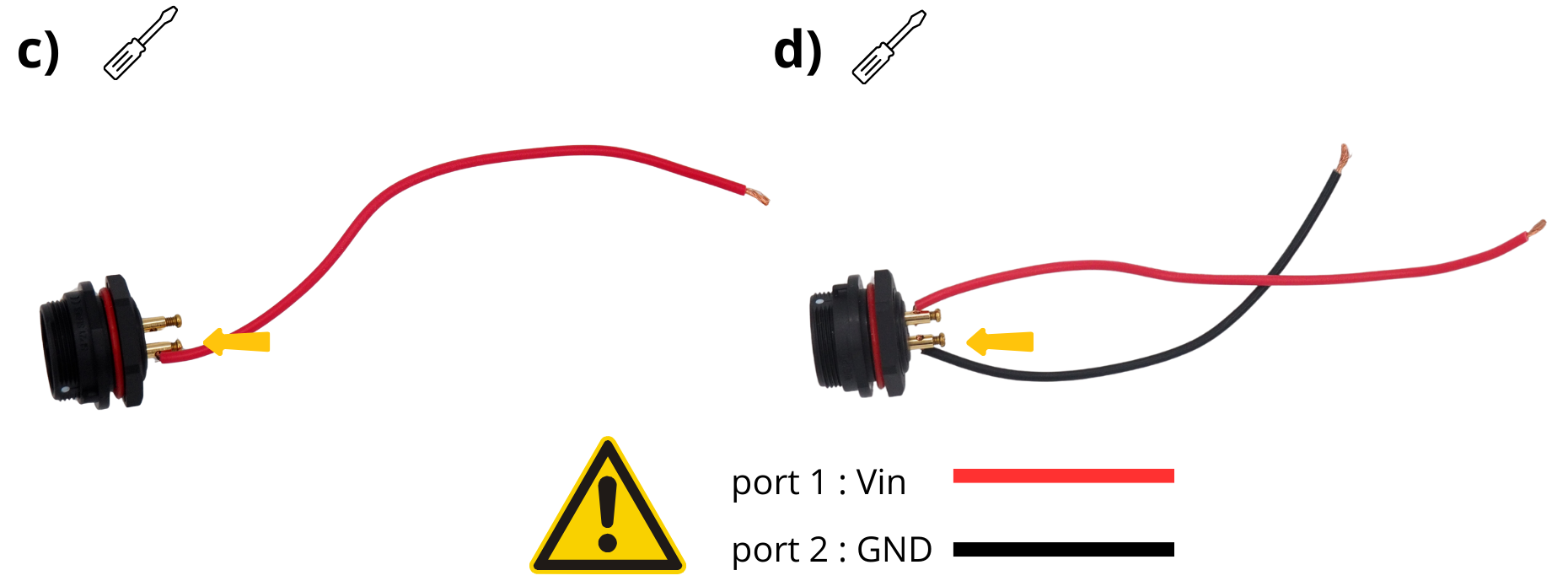 Afin d’éviter tout court-circuit entre le câble GND (Noir) et le câble VIN (Rouge), ajouter une gaine thermorétractable.