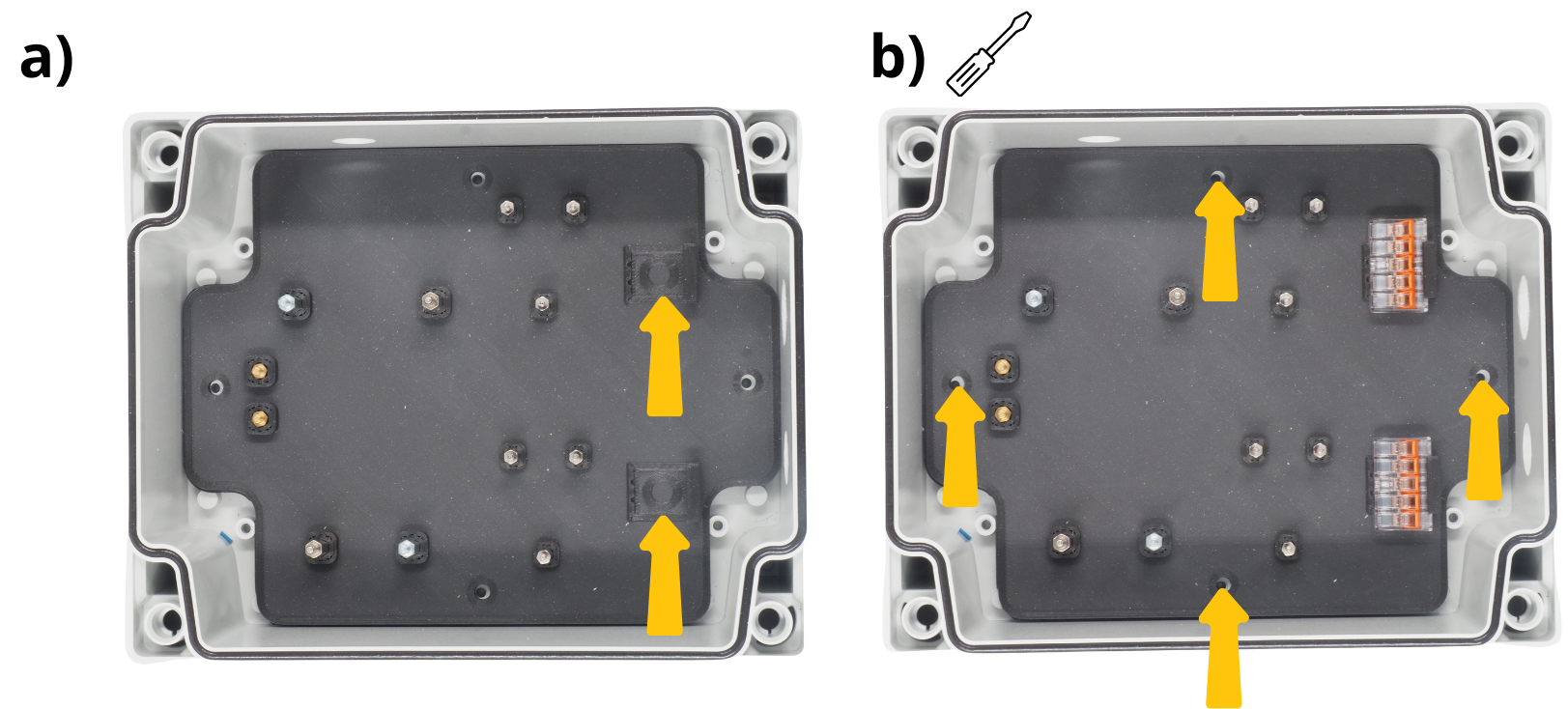 Pour les étapes qui suivent, il vous sera réguliérement demandé d’insérer des câbles dans différents borniers à vis, puis de les visser. Pour cela, il sera parfois nécessaire de d’abord dévisser le bornier à vis (voir image), afin de l”ouvrir, et permettre d’y insérer un câble avant de revisser pour fermer le bornier sur câble.