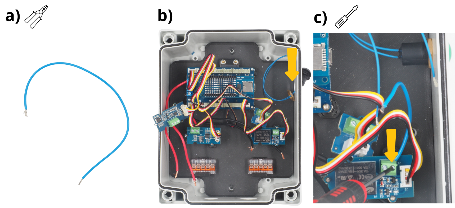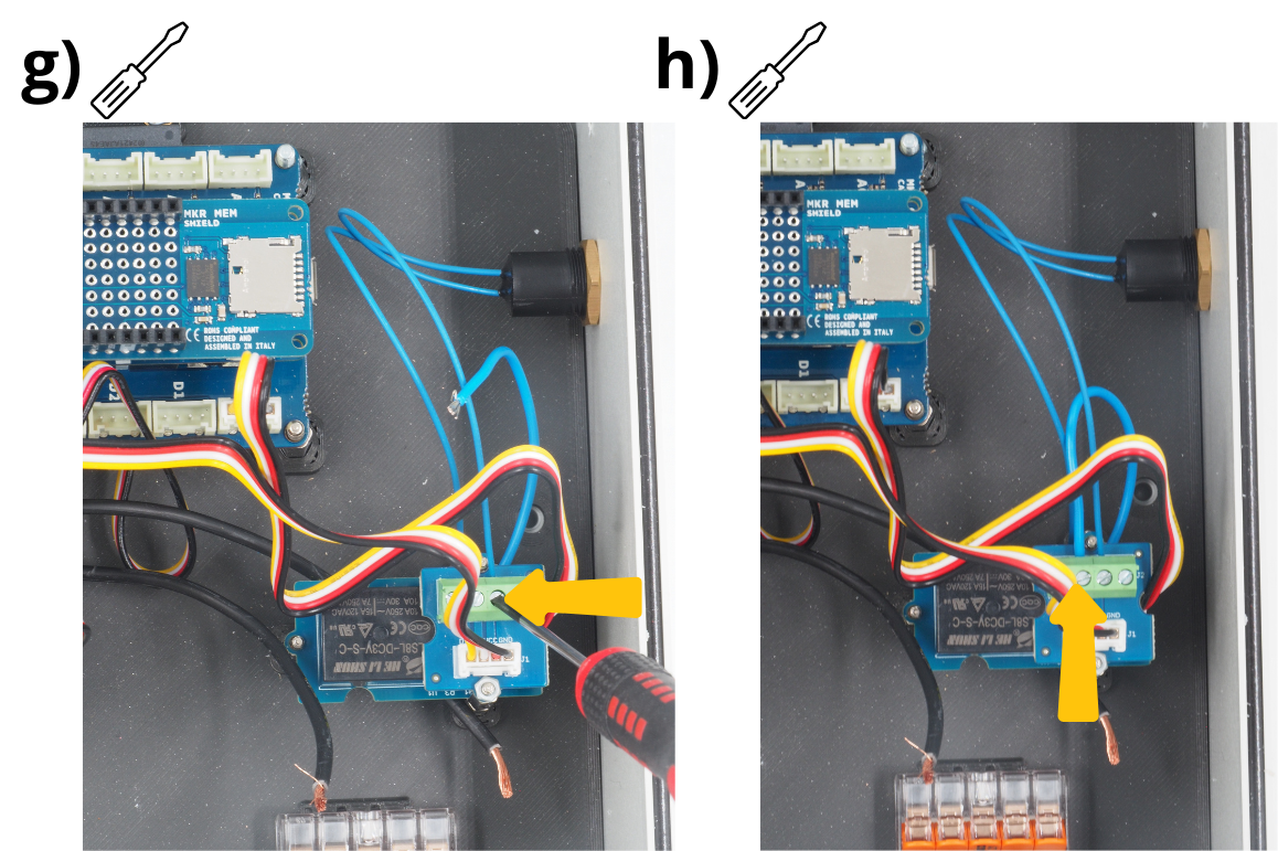 Insérer une des extrémités du câble bleu dans un des borniers à vis (au choix) du module Grove Relay, puis le visser.