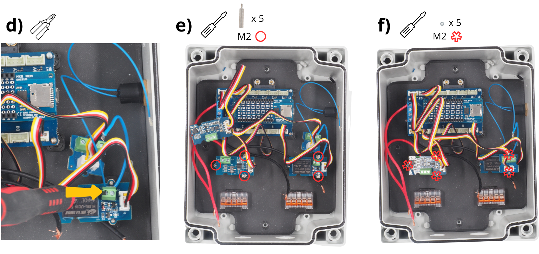 Fixer à l’aide d’écrous M3 l’empilement de carte Arduino sur les entretoises prévues à cet effet (au dessus de la carte Gravity RTC). Placer les module Grove Voltage Divider et Grove Relay sur les entretoises M2 restantes.
