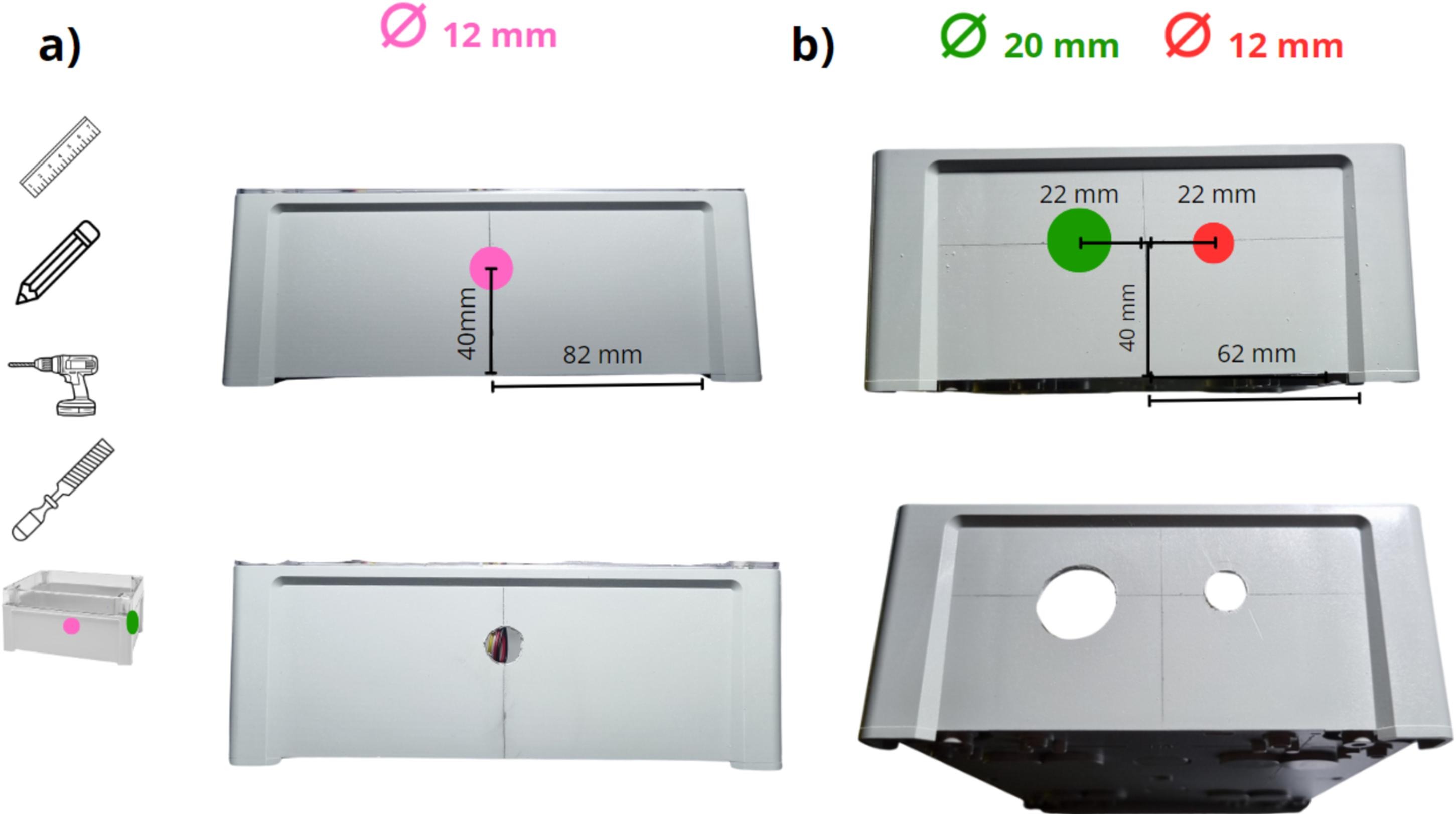 Tomar la caja y perforar un agujero de 20 mm de diámetro en el lado más corto, así como un agujero de 12 mm de diámetro (ver indicación abajo).