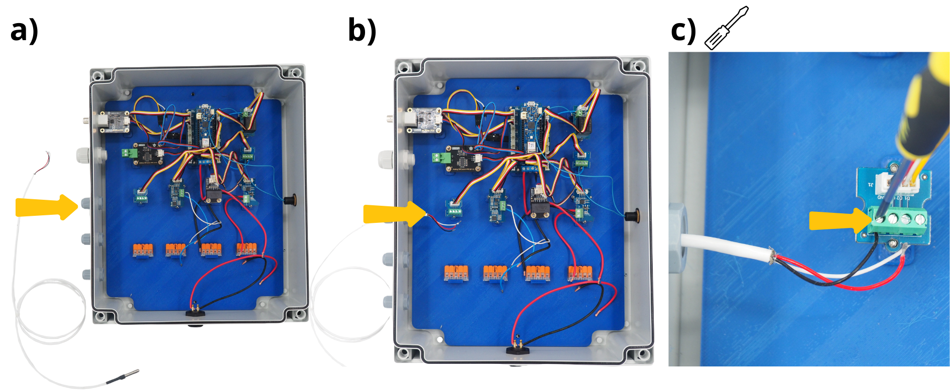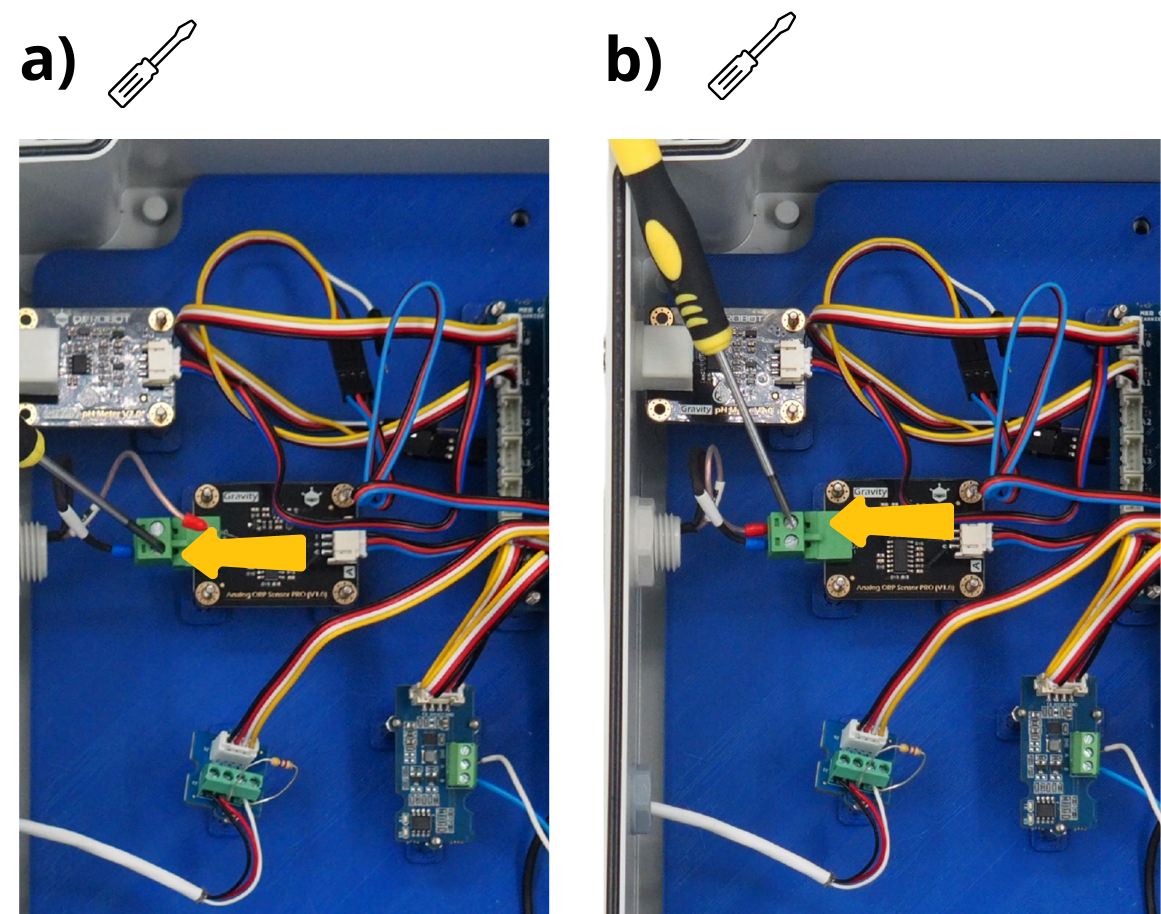 Pour les étapes qui suivent, il vous sera réguliérement demandé d’insérer des câbles dans différents borniers à vis, puis de les visser. Pour cela, il sera parfois nécessaire de d’abord dévisser le bornier à vis (voir image), afin de l”ouvrir, et permettre d’y insérer un câble avant de revisser pour fermer le bornier sur câble.