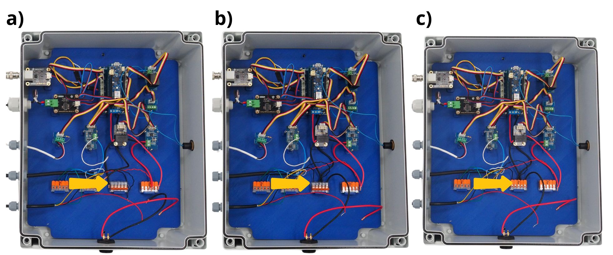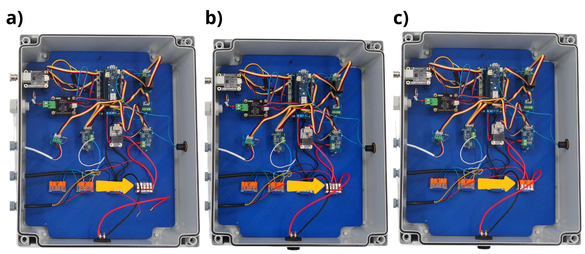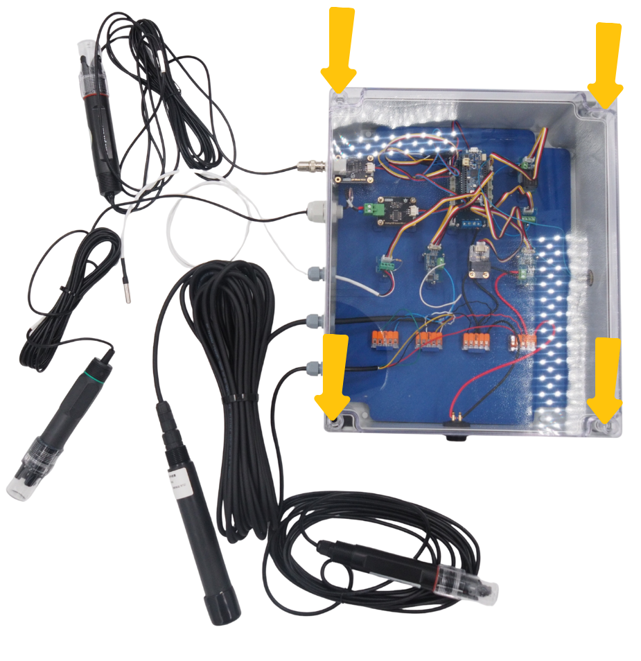Fijar con tuercas M3 las tarjetas de sensor ORP, sensor pH, Arduino y RTC. Luego fijar con tuercas M2 las tarjetas RS485, divisor de voltaje, terminal de tornillo y relé.