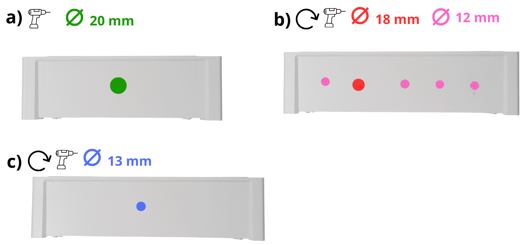 Rotar la caja 90 grados para situarse en uno de los lados más largos y perforar un agujero de 12 mm, luego uno de 18 mm, y finalmente tres de 12 mm (ver indicación abajo).