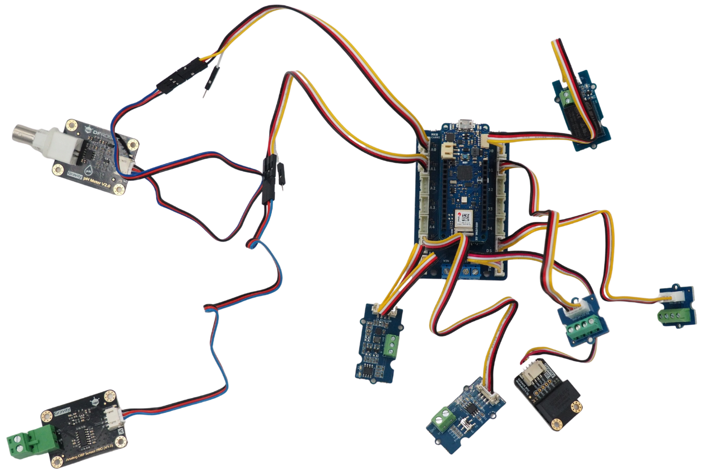 Insertar en cada palanca la terminación restante de los cables negros siguientes: procedentes del módulo Grove Voltage Divider, del bloque de alimentación, de la placa Arduino CARRIER, del sensor Oxígeno Disuelto y del sensor Conductividad.