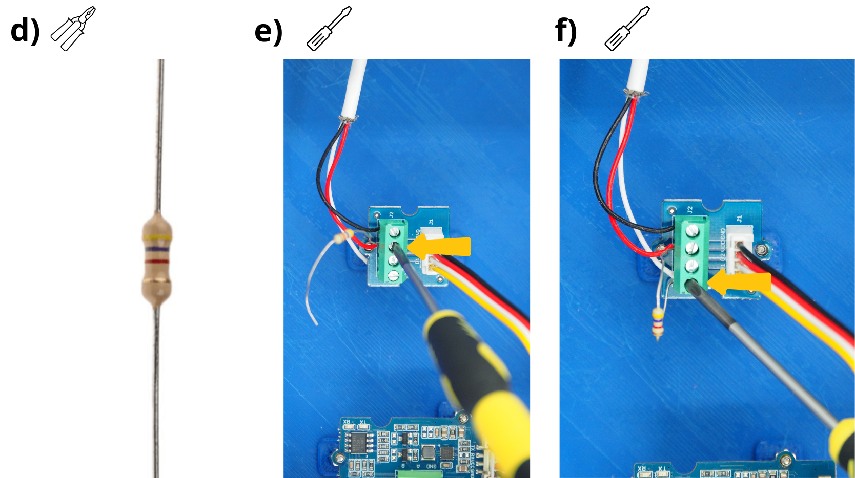 Insérer le câble rouge du capteur de température ainsi qu’une des extrémités de la résistance 4.7 kOhm dans le bornier à vis «VCC» du second Module Screw Terminal, puis visser le.
