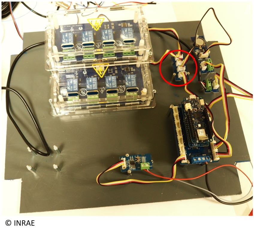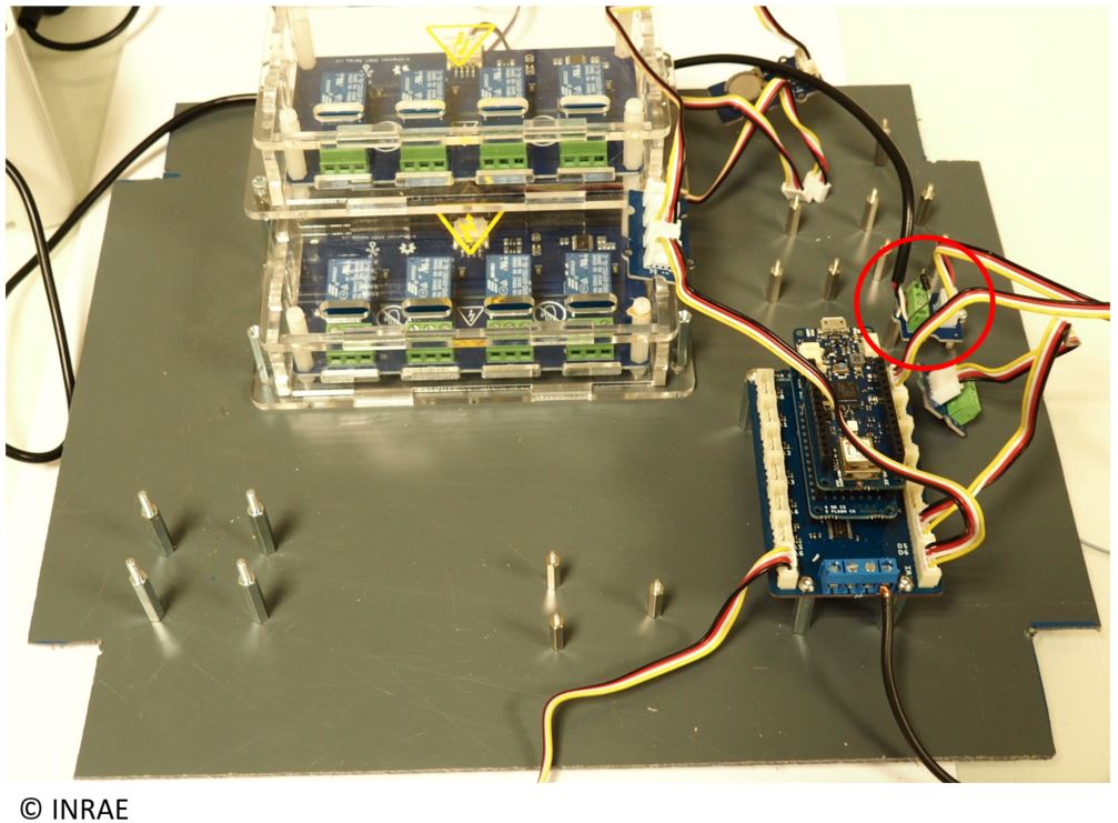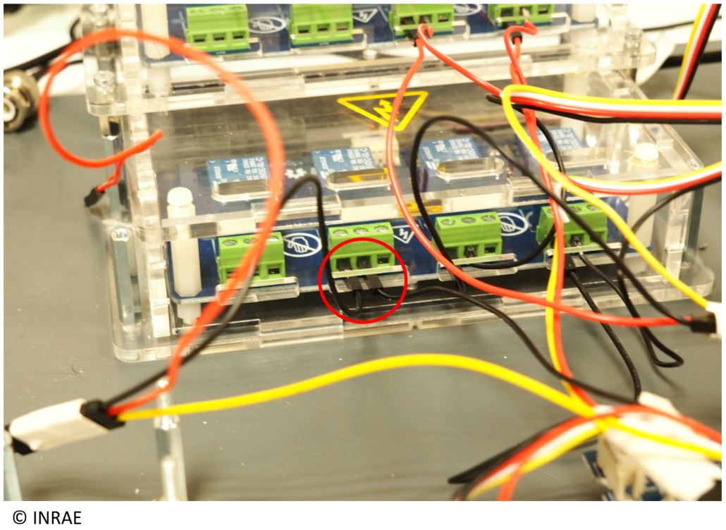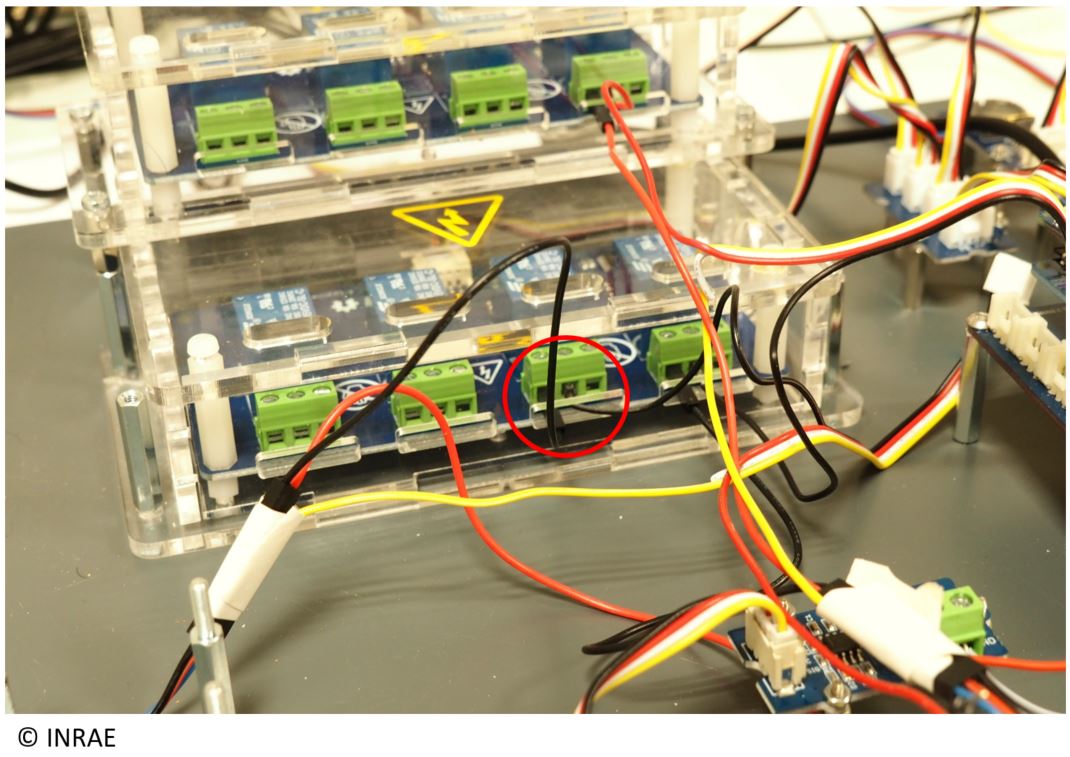 Connecter le cable noir provenant du capteur sur l’entrée gauche de la première carte relais, troisième relais. Ensuite, connecter le cable noir provenant du connecteur MKR carrier à l’entrée centrale de la première carte relais, troisième relais.