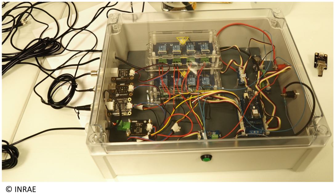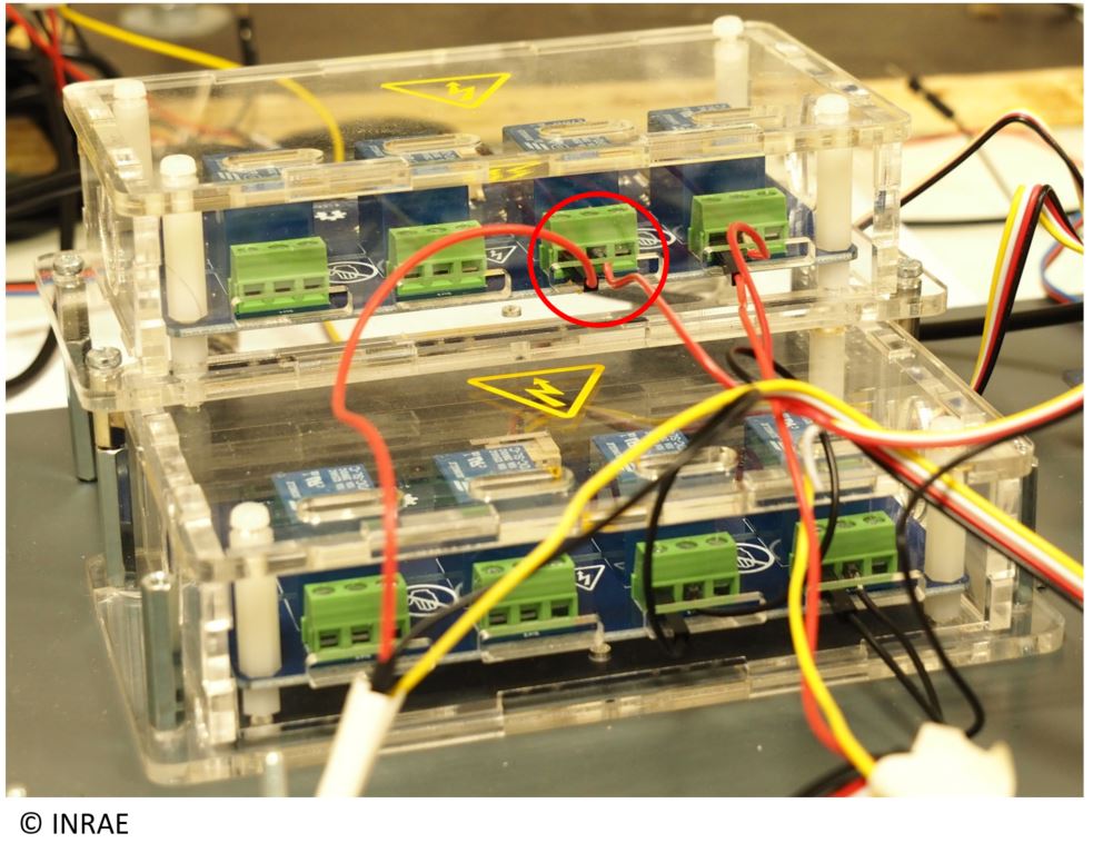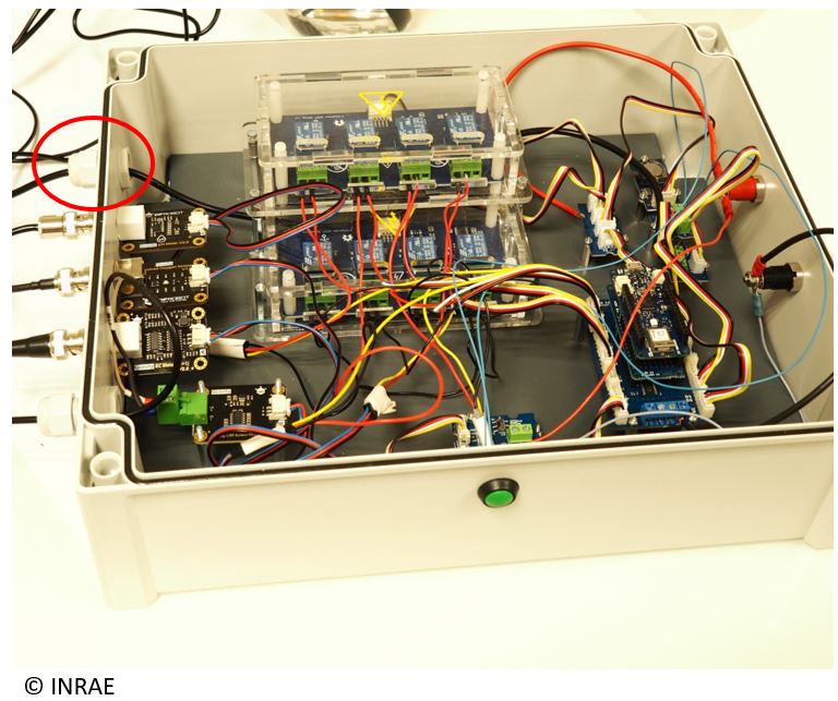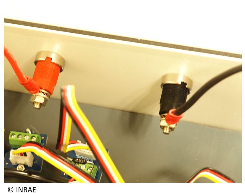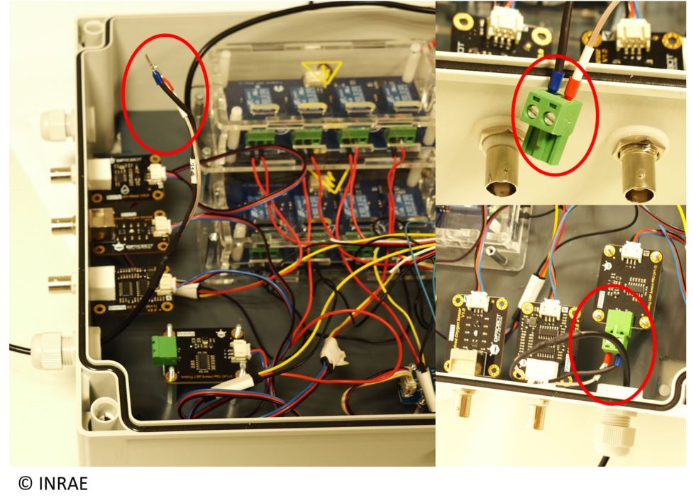 Insérer les différents cables BNC des capteurs sur leurs cartes, en suivant cet ordre de haut en bas: pH, O2, Conductivité (trou de diamètre 12 mm).