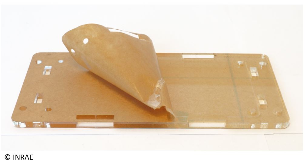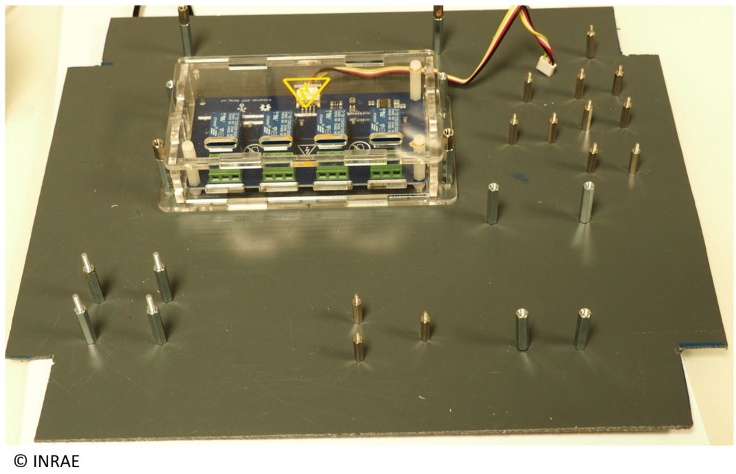 Prendre un morceau de bois, PVC, ou tout élément non conducteur, et le couper suivant le fichier « Physico_Chemical_datalogger_hole.pdf » afin de réaliser la plaque fixation des différents éléments du datalogger. Percer les trous afin de placer les différentes entretoises.