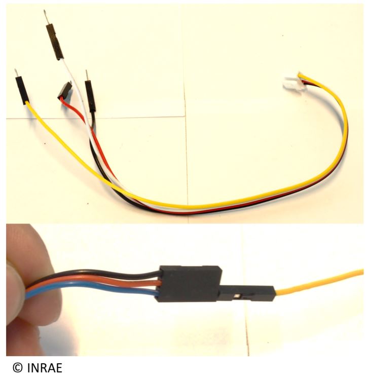 Prendre le cable picot/Grove. Connecter le fil jaune sur le fil bleu du cable provenant de la carte du capteur DFR0300.