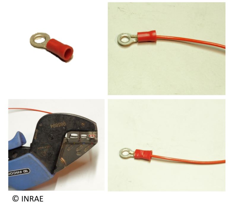 Prendre 1 cosse à sertir. Utiliser une pince à sertir afin de le fixer sur une des extrémités du cable noir diamètre 3 mm.