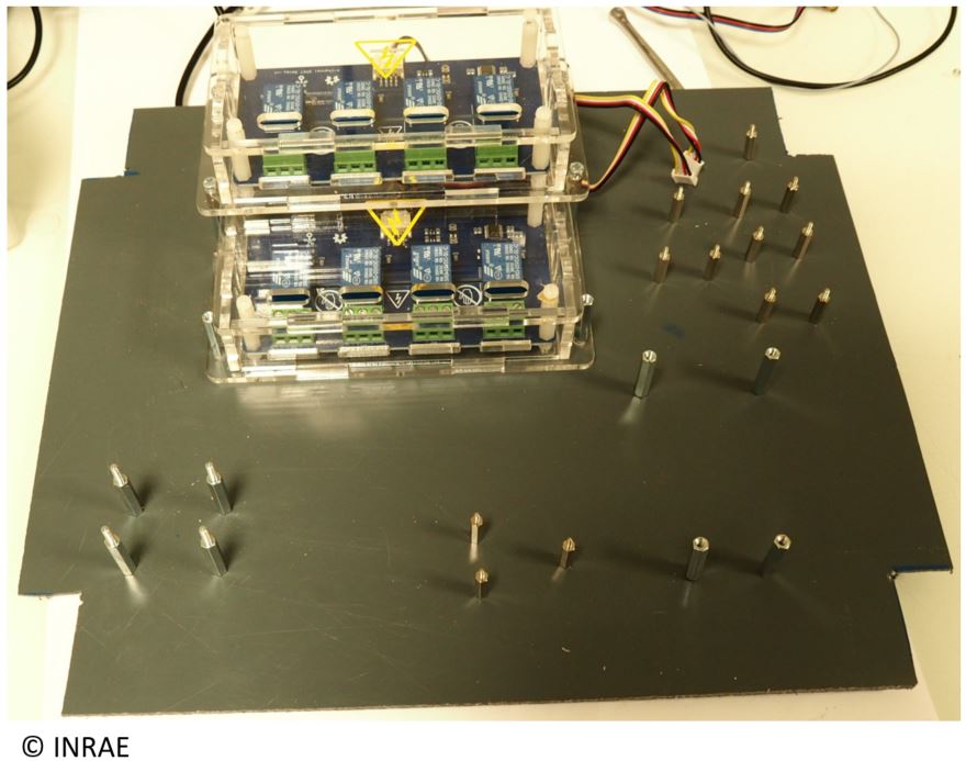 Fixer la premiere carte carte 4 relais avec des entroises M3 sur la partie arrière de celle-ci (« en suivant les indications du fichier physico_chemical_datalogger_hole.pdf »).