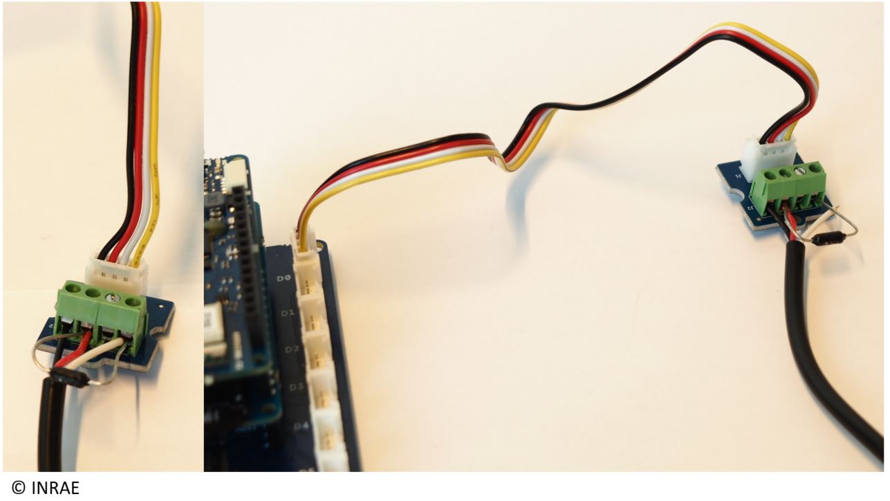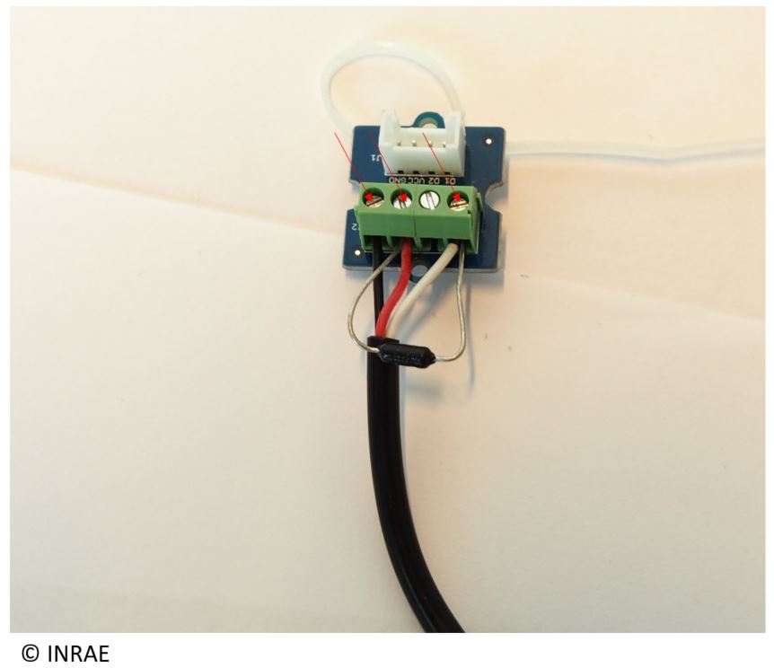 Brancher le cable noir du capteur de température sur le port GND de la carte module bornier à vis, le cable rouge sur le port VCC, et le cable blanc sur le port D1.